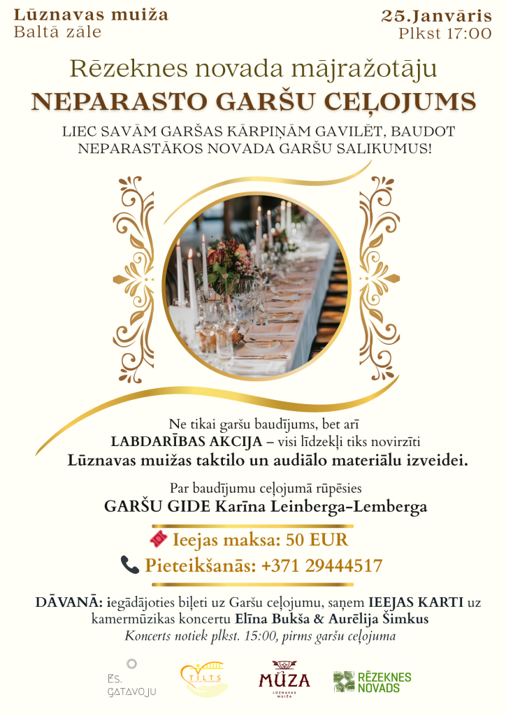 25. janvārī plkst. 17.00 Lūznavas muižas Baltajā zālē norisināsies neparasts notikums – Rēzeknes novada mājražotāju garšu ceļojums, kas apvienos izsmalcinātu baudījumu, stāstu un labdarības mērķi — padarīt Lūznavas muižu pieejamāku cilvēkiem ar funkcionāliem traucējumiem.