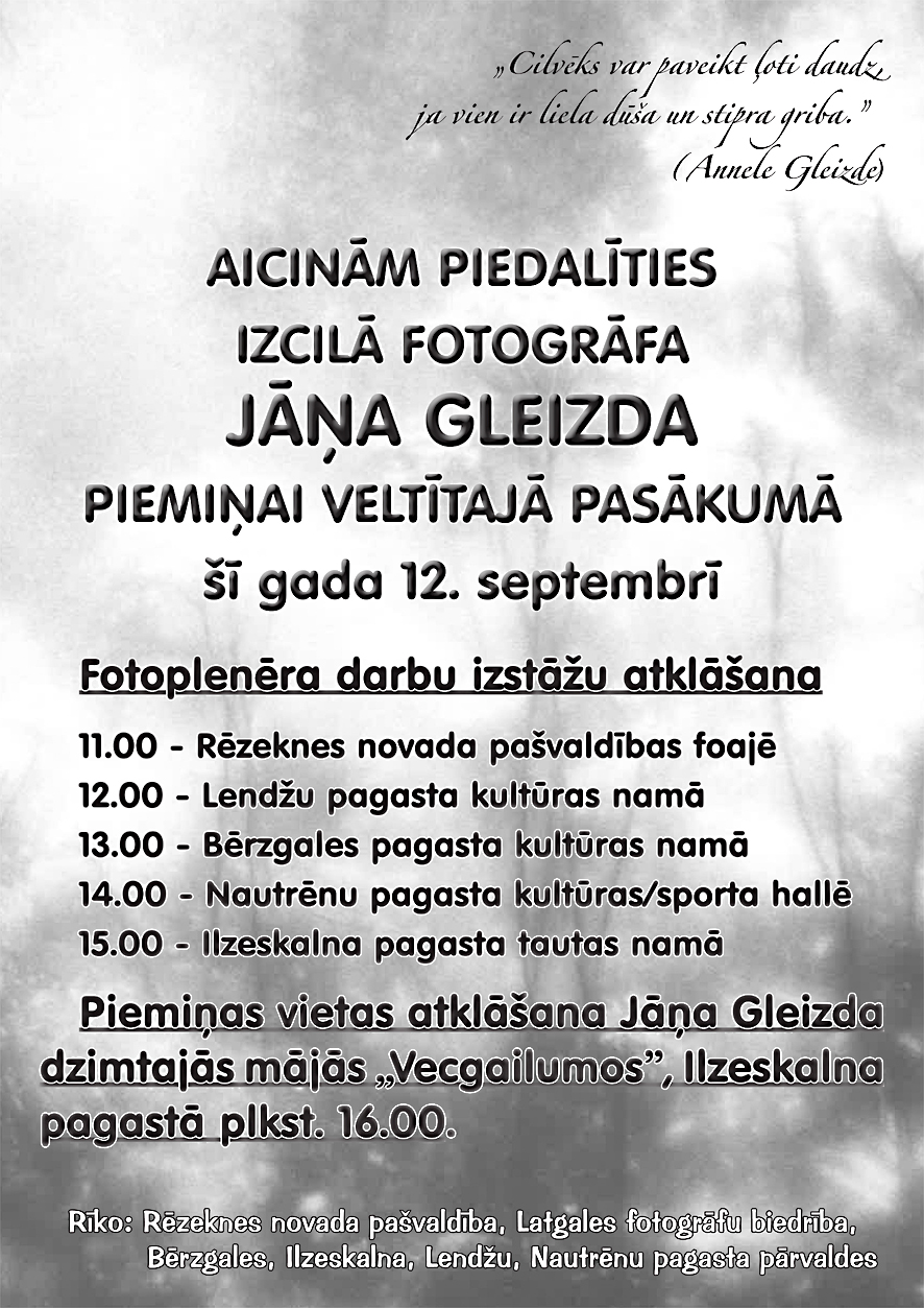 Plašais pasākumu cikls izcilā fotogrāfa piemiņai, ko rīko Rēzeknes novada pašvaldība sadarbībā ar Latgales fotogrāfu biedrību noslēgsies 12. septembrī pulksten 16:00 ar piemiņas vietas atklāšanu Jāņa Gleizda dzimto māju vietā Ilzeskalna pagasta Vecgailumos. Piemiņas akmens atradīsies labiekārtotā laukumā, Jāņa Gleizda tēva stādītās liepas paēnā, blakus atjaunotajam krucifiksam.