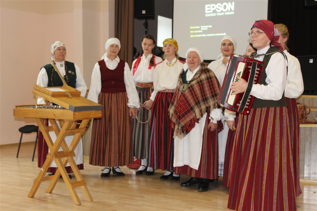 Pie tējas tases ar ābolu pīrāgiem, jautrā, sirsnīgā gaisotnē norisinājās kolektīvu uzstāšanās, rotaļas mijās ar dančiem, jokiem, sirsnīgiem vārdiem.