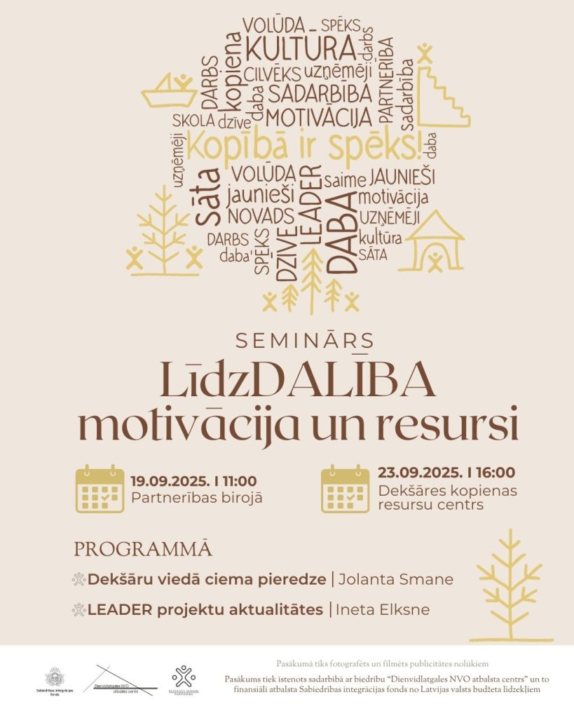 Biedrība “Rēzeknes novada partnerība” sadarbībā ar biedrību “Dienvidlatgales NVO atbalsta centrs” organizē semināru “LīdzDALĪBA – motivācija un resursi” par pieredzi kopienas līdzdalības iesaistē un LEADER pieeju 19. septembrī plkst. 11.00 Partnerības birojā Atbrīvošanas alejā 90, Rēzeknē un 23. septembrī plkst. 16.00 Dekšāres kopienas resursu centrā, Nākotnes ielā 4, Dekšāres, Rēzeknes novadā (abās dienās semināra programma ir vienāda).