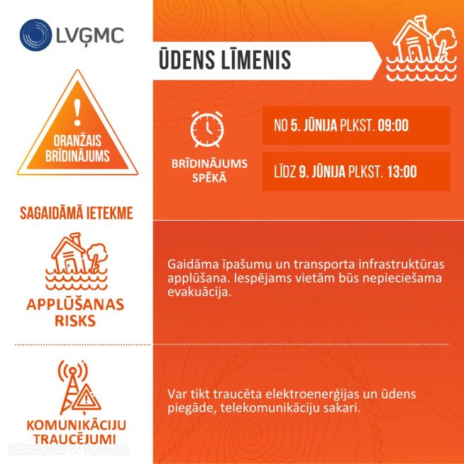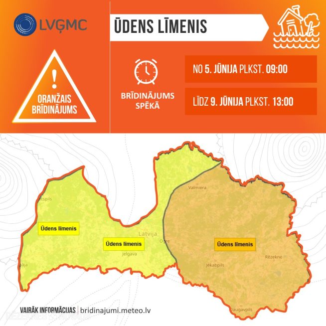 LATVIJAS VIDES, ĢEOLOĢIJAS UN METEOROLOĢIJAS CENTRS un VALSTS UGUNSDZĒSĪBAS UN GLĀBŠANAS DIENESTS informē, ka Latvijā naktī uz 5. jūniju un 5. jūnija dienas laikā plašā Latvijas teritorijā gaidāmas intensīvas lietusgāzes. Latvijas rietumu daļā ir lijis mazāk, tāpēc intensīvais lietus radīs īslaicīgu zemāko teritoriju applūšanu un ūdenslīmeņa paaugstināšanos upēs. Centrālajos un īpaši austrumu rajonos plaši applūdīs zemākās teritorijas, kā arī upju palienes.