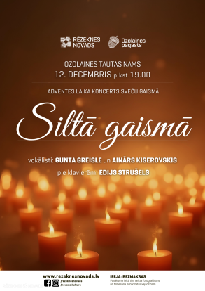 Aicinām sveču gaismā izbaudīt Adventes laika koncertu “Siltā gaismā”. Klausītājus priecēs brīnišķīgie vokālisti- Gunta Greisle un Ainārs Kiserovskis, pie klavierēm- Edijs Strušels.