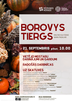 “Borovys tiergs” ir rudens noskaņu un Latgales amatniecības garšu piesātināts pasākums, kas tradicionāli pulcē gan tirgotājus, gan kultūras cienītājus, radot dzīvu un krāsainu tirgus atmosfēru Maltas kultūras nama pagalmā. Apmeklētāji varēs iegādāties vietējo amatnieku, mājražotāju un zemnieku produkciju, baudīt daudzveidīgu kultūras programmu un piedalīties radošajās darbnīcās visai ģimenei.