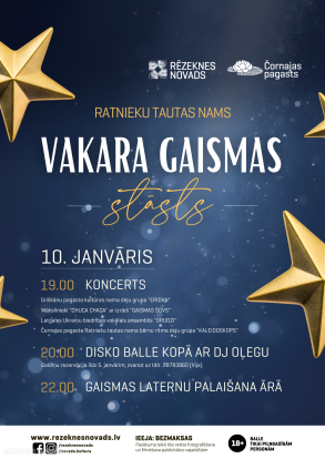 Aicinām piedalīties ikgadējā pasākumā, kurš notiks 10. janvārī plkst. 19.00. Pirms diskoballes vakara gaitā gaismas stāsta mirdzumu ar krāšņiem vizuāliem priekšnesumiem uzburs Griškānu pagasta deju grupa “Eridan” un Čornajas pagasta Ratnieku tautas nama bērnu ritma deju grupa “Kaleidoskops”, savukārt Latgales Ukraiņu biedrības vokālais ansamblis “Druzi” skatītājus priecēs ne tikai ar skanīgām dziesmām, bet arī ar interesantiem vakara stāstiem. Svētku noskaņu un pozitīvas emocijas sniegs oriģinālā žanra mākslinieki “Chuca Chaca'”ar aizraujošu izrādi “Gaismas šovs”.
