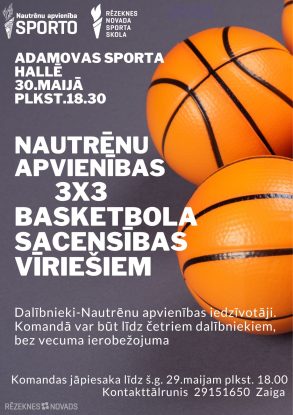 Aicinām piedalīties Nautrēnu apvienības 3×3 basketbola sacensībās vīriešiem, Adamovas sporta hallē 30. maijā plkst. 18.30!