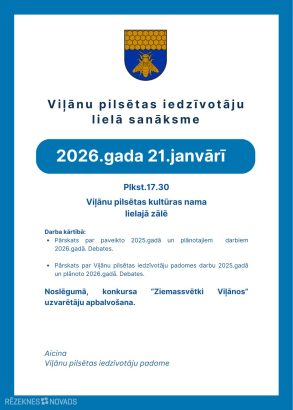 Viļānu pilsētas Iedzīvotāju padome 2026. gada 21. janvārī plkst. 17,30 aicina uz ikgadējo iedzīvotāju sanāksmi, kura notiks pilsētas kultūras nama lielajā zālē. Pārrunāsim, kas paveikts 2025.gadā un apspriedīsim plānotos darbus šim gadam. Sanāksmes noslēgumā godināsim konkursa “Ziemassvētki Viļānos” uzvarētājus. Dāvanas ir jau sarūpētas! Atliek tās pateicībā pasniegt katram, kurš Viļāniem ļāva mirdzēt. Labais vairo labo! Tiekamies jau pavisam drīz 21. janvārī plkst. 17.30.