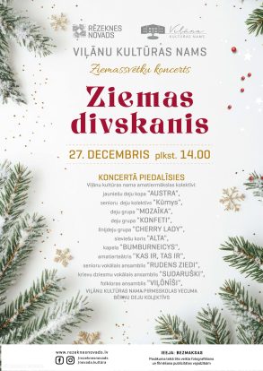 Aicinām uz Ziemassvētku koncertu, kurā Viļānu kultūras nama amatiermākslas kolektīvi ar humoru, siltumu un īstām emocijām izdzīvos svētku gaidīšanas stāstus — no kārtīgas gatavošanās līdz pilnīgam apjukumam. Bet noslēgumā visi satiksimies vienā priecīgā kopībā, jo Viļānu kultūras nams būs gatavs svētkiem no visas sirds. Koncertā piedalīsies jauniešu deju kopa “Austra”, senioru deju kolektīvs “Kūmys”, Viļānu kultūras nama pirmsskolas vecuma bērnu deju kolektīvs, deju grupa “Mozaīka”, “Konfeti”, līnijdeju grupa “Cherry lady”, sieviešu koris “Alta”, kapela “Bumburneicys”, amatierteātris “Kas ir, tas ir”, senioru vokālais ansamblis “Rudens ziedi”, krievu dziesmu vokālais ansamblis “Sudaruški”, folkloras ansamblis “Viļōnīši”.