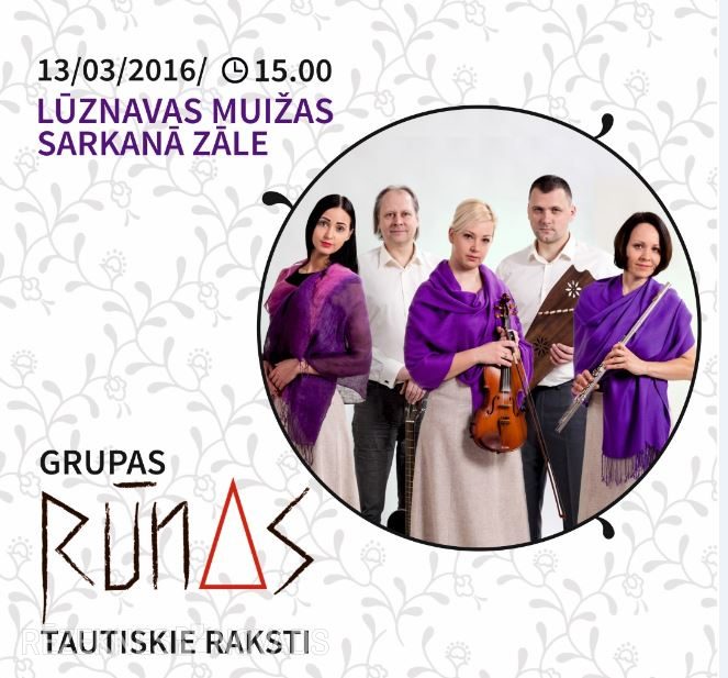 13. martā 15.00 Lūznavas muižas viesiem pirmajiem būs iespēja būt klāt piedzimšanas Mūzas dienā – savu pirmo īsto koncertu sniegs jauna, Rēzeknē tapusi grupa “Rūnas”, kurā Jāņa Mežinska vadībā apvienojušies vairāki muzikāli Rēzeknes puses ļaudis, lai ar balsi un dažādiem instrumentiem (vijole, ģitāra, flauta u. c.) kopā radītu īpašu skanējumu. Grupas programmas pamatā ir savs skatījums uz latgaliešu un latviešu dainām, kā arī pieskaršanās pasaules mūzikai un dainu savijums oriģinālmelodijās. Grupa “Rūnas” priecājas un apzinās to lielo spēku, kas ielikts tautas mūzikā, un caur šiem tautas rakstiem mēģinās izprast un parādīt cilvēka vietu Visumā. Lai debijas koncertu padarītu īpašāku, “Rūnas” aicinās apmeklētājus ļauties sadziedāšanās burvībai Lūznavas muižas Sarkanajā zālē.