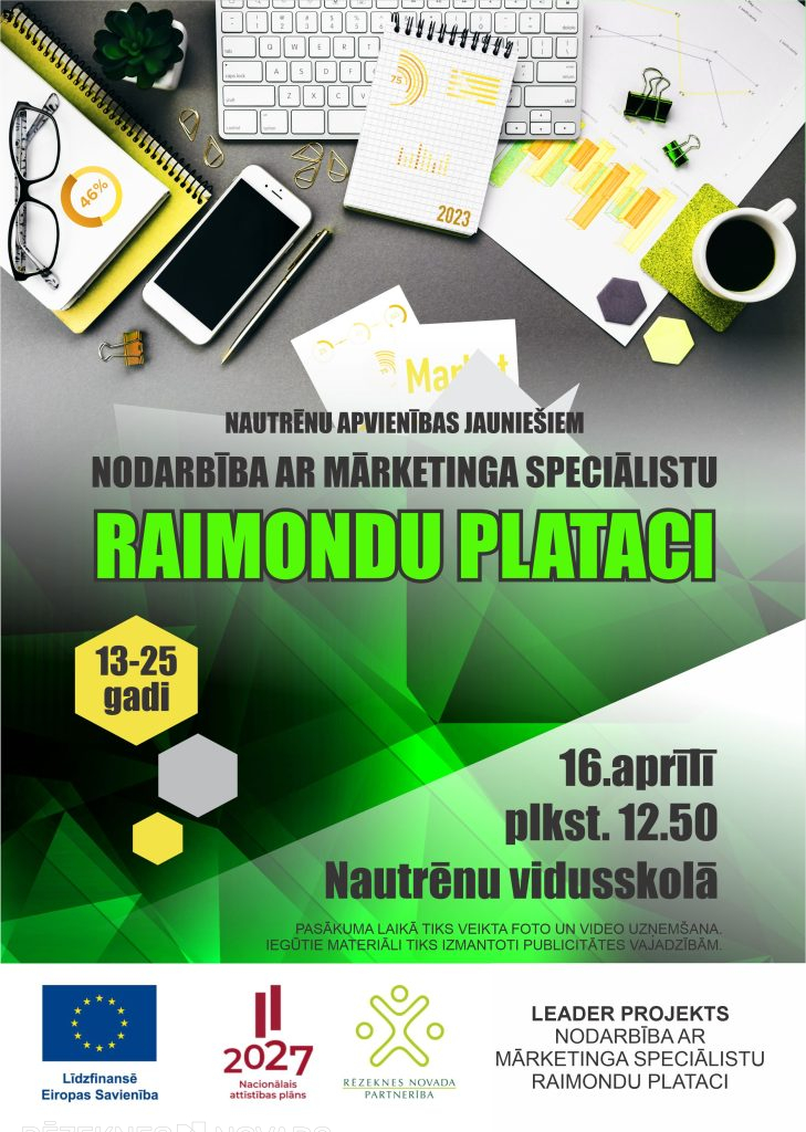 Nautrēnu apvienībā ES ELFLA intervences "Darbību īstenošana saskaņā ar sabiedrības virzītas vietējās attīstības stratēģiju, tostarp sadarbības aktivitātes un to sagatavošana" (LA 19) aktivitātē "Kopienu spēcinošas un vietas attīstību sekmējošas iniciatīvas" atbalstītā projekta “Aktīvai jaunatnei Nautrēnu apvienībā” ietvaros 16. aprīlī plkst. 12.50 Nautrēnu apvienības pagastu jauniešiem būs iespēja piedalīties aizraujošā un izzinošā nodarbībā par mārketinga pamatiem, kuru vadīs mārketinga speciālists Raimonds Platacis.