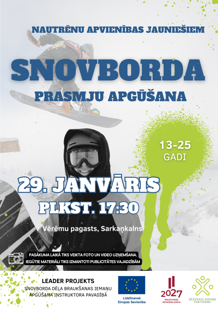 Nautrēnu apvienībā ES ELFLA intervences "Darbību īstenošana saskaņā ar sabiedrības virzītas vietējās attīstības stratēģiju, tostarp sadarbības aktivitātes un to sagatavošana" (LA 19) aktivitātē "Kopienu spēcinošas un vietas attīstību sekmējošas iniciatīvas" atbalstītā projekta "Aktīvai jaunatnei Nautrēnu apvienībā" ietvaros 29. janvārī plkst. 17.30. Nautrēnu apvienības pagastu jaunieši dosies uz Sarkaņkalnu Vērēmu pagastā, lai pieredzējušu instruktoru vadībā apgūtu snovborda dēļa braukšanas iemaņas.