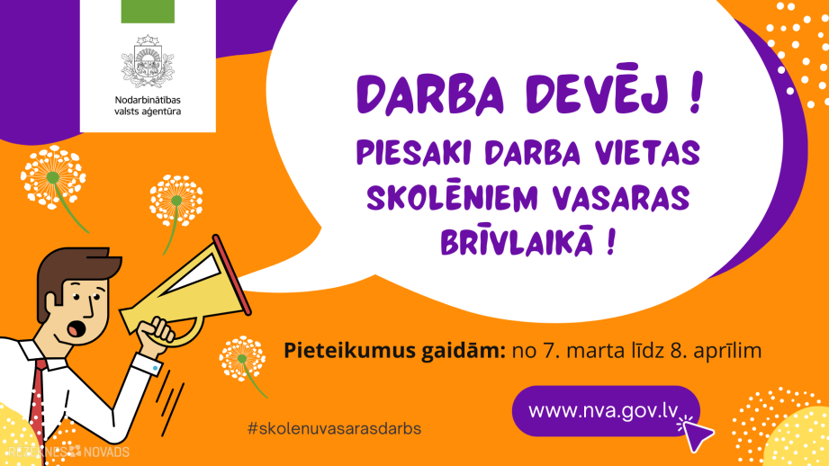 Contact details of all NVA branches can be found in THE NVA website section “Contacts“. The form of the application documents is available in THE NVA website“ I offer a job ”(https://www.nva.gov.lv/lv/piedavaju-darbu-skolenu-vasaras-nodarbinatiba)