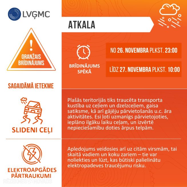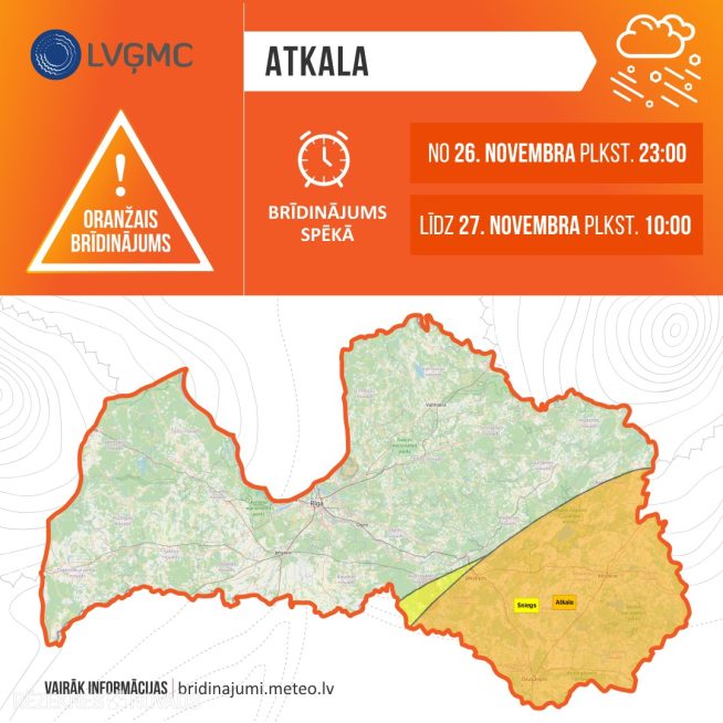 Oranžais brīdinājums: no 26.11. plkst. 23.00 līdz 27.11. plkst. 10.00