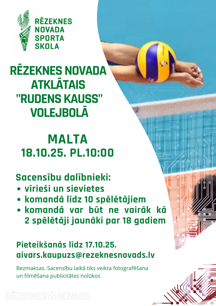 18. oktobrī Maltas daudzfunkcionālajā zālē notiks Rēzeknes novada atklātais turnīrs “Rudens kauss” volejbolā, lai noskaidrotu labākās vīriešu un sieviešu komandas.