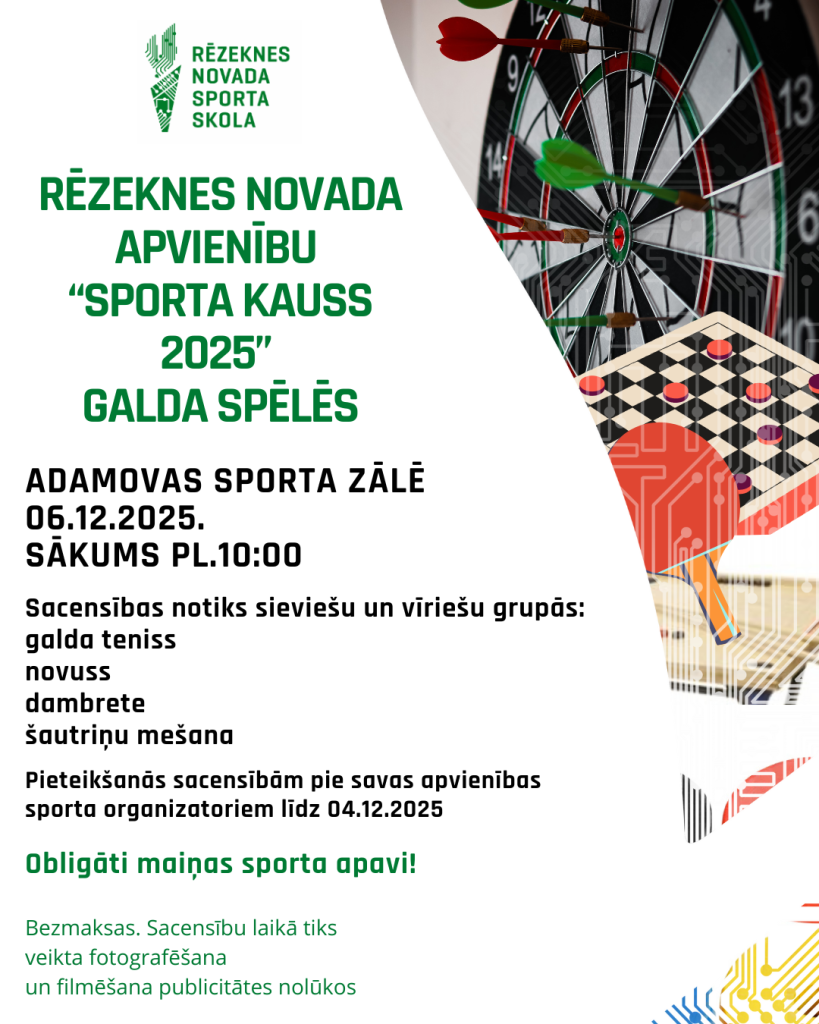 6. decembrī Adamovas sporta zālē norisināsies šī gada novada apvienību “Sporta Kauss” noslēguma posms, kurā azartiskākie sacentīsies galda spēlēs.