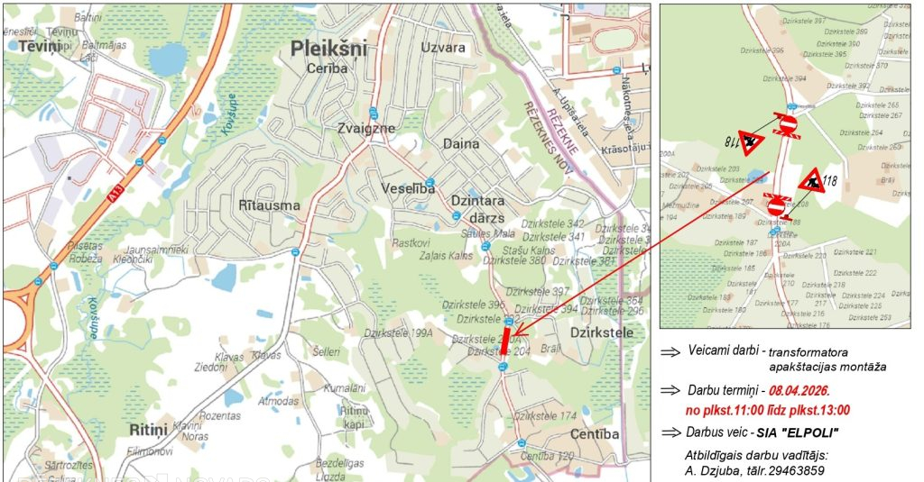 2026. gada 8. aprīlī no plkst. 11.00 līdz 13.00 būs ierobežota satiksme Dzirksteles ielā Pleikšņu ciemā, Ozolaines pagastā. Iedzīvotāji tiek aicināti savlaicīgi plānot pārvietošanos un būt saprotošiem par īslaicīgām neērtībām.