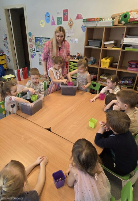 Ievadā bērni uzzināja, ka sēklas spēj dīgt gan augsnē, gan bez tās. Mazie pētnieki ar interesi aplūkoja sēklu iepakojumus, pētot attēlus un sēklu nosaukumus.