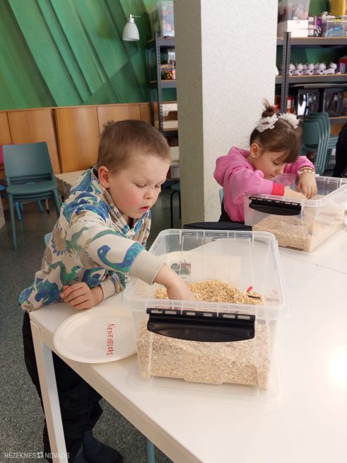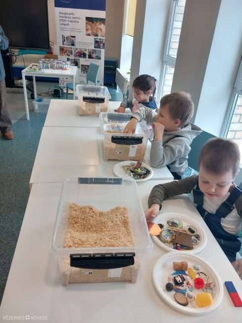 Turpinājumā sekoja praktiskā darbošanās “Apslēpto dārgumu meklētājs”. Kastē ar skaidām bija paslēpti dažādi priekšmeti, un bērniem ar magnēta palīdzību tie bija jāatrod un jāsašķiro – kuri pievelkas un kuri nepievelkas. Sameklētos priekšmetus bērni nosauca un noteica to materiālu (piemēram, koks, metāls, organiskais stikls u. c.). Darbošanās sagādāja daudz prieka, veicināja uzmanību un attīstīja pētnieciskās prasmes.