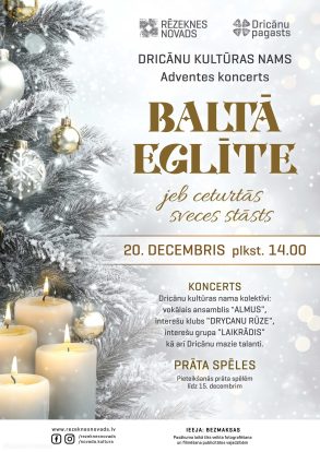 Dricānu pagasta kultūras nams aicina uz nedaudz neparastu ceturtās adventes priekšvakaru – Dricānu pagasta kultūras nama kolektīvu koncertu un Prāta spēlēm. Nelielā klusā laika koncertā Jūs priecēs vokālais ansamblis “Almus”, interešu klubs “Drycanu rūze” un interešu grupa “Laikrādis”, kā arī Dricānu mazie talanti.