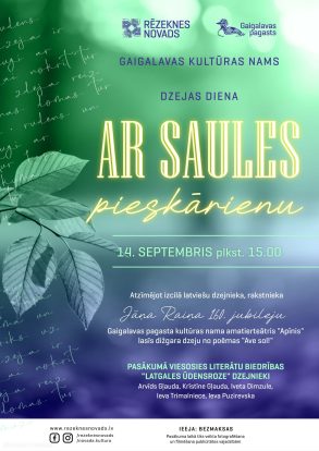 Aicinām ikvienu pabūt kopā dzejas dienu pasākumā “Ar saules pieskārienu”! Atzīmējot izcilā latviešu dzejnieka, rakstnieka, politiķa un sabiedriskā darbinieka Jāņa Raiņa 160. jubileju, pasākumā Gaigalavas pagasta kultūras nama amatierteātris “Apīnis” lasīs dižgara dzeju no poēmas “Ave sol!”. Saules tēls Raiņa daiļradē tiek salīdzināts ar dzīvības spēku. Gadalaiku maiņas dabā, sabiedrības dzīve, indivīda dzīves ceļš – viss ir pakļauts saules gaitas ritmam.