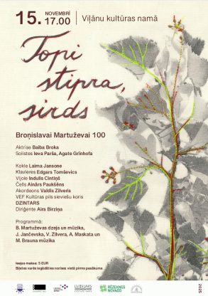 Valsts svētku noskaņās 15. novembrī plkst. 17.00 Viļānu kultūras namā klausītāji aicināti uz koncertuzvedumu “Topi stipra, sirds”, kas veltīts izcilās latviešu dzejnieces un dziesminieces Broņislavas Martuževas 100. jubilejai. Koncertuzveduma mākslinieciskās koncepcijas autores ir diriģente Aira Birziņa un Jaunā Rīgas teātra aktrise Baiba Broka. Dzejnieces Broņislavas Martuževas (1924–2012) simtgade tika atzīmēta 2024. gada 8. aprīlī. B. Martuževa ir vesela laikmeta leģenda, kuras dzeja nav atdalāma no viņas personības – to caurvij ticības spēks, kristīga cilvēka tīrais dzīves redzējums un patiesa tēvzemes mīlestība.