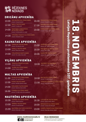 18. novembrī visas dienas garumā Rēzeknes novads vienosies Latvijas Republikas proklamēšanas gadadienas svinībās. Piecās Rēzeknes novada apvienībās skanēs svētku koncerti, aicinot būt kopā, pateikties līdzcilvēkiem un ar lepnumu atzīmēt mūsu Latvijas 107. dzimšanas dienu.