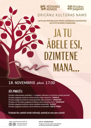 Aicinām uz Latvijas Republikas proklamēšanas gadadienai veltīto koncertu “Ja tu ābele esi, dzimtene mana”. Pasākumā tiks sumināti vietējie iedzīvotāji, uzņēmēji un savas puses patrioti.
