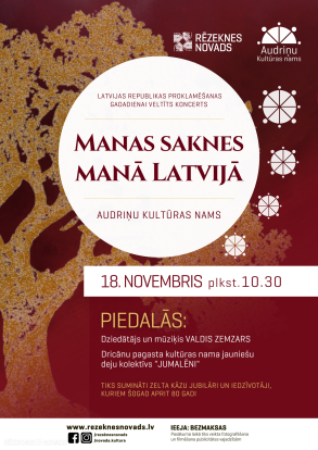 Aicinām Latvijas Republikas proklamēšanas gadadienai veltīto svētku koncertu “Manas saknes manā Latvijā”! Šajā dienā priecāsimies svinēt svētkus kopā ar jums. Svinīgajā koncertā piedalās dziedātājs un mūziķis Valdis Zemzars un Dricānu pagasta kultūras nama jauniešu deju kolektīvs “Jumalēni”.