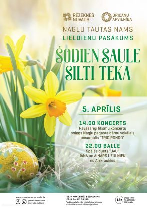 Pavasarīgi līksmu koncertu plkst. 14.00 sniegs Nagļu pagasta dāmu vokālais ansamblis “Trio Rondo”. Ansambli veido Dace Stikāne, Līga Salmane un muzikālā vadītāja Anita Mičule. Dāmas kopā muzicē jau 11 gadus un ar savu skanīgo sniegumu katrreiz priecē publiku. Un kā gan Lieldienās bez grezna danča? Bet – kas dejos? Tas lai paliek kā pārsteigums.