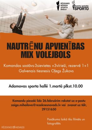 Aicinām Nautrēnu apvienības iedzīvotājus uz volejbola sacensībām mix komandām (3 sievietes + 3 vīrieši), sacensības notiks Adamovas sporta hallē, 1. martā, plkst. 10.00