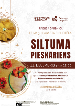 Aicinām piedalīties radošā darbnīcā, kurā apvienosim divas pasaules – slapjās filcēšanas tehniku un rotu radīšanu, darbnīcas laikā dalībnieki izveidos savu ziedu brošiņu un apgūs slapjās filcēšanas pamatus. Meistarklasi vadīs Augšdaugavas novada Maļinovas bibliotēkas vadītāja Elvīra Kokina, visi nepieciešamie materiāli tiks nodrošināti.
