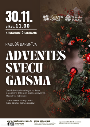 Kad dienas kļūst īsākas un gaisā jūtams pirmo sniegpārslu vieglums, tuvojas adventes laiks, kad mājās iemirdzas sveču liesmas, sirdis piepildās ar mieru un pateicību. Aicinām uz radošo darbnīcu, lai kopā radītu savu adventes vainagu – cerības, gaismas un atgriešanās simbolu. Darbnīcā tiks veidoti vainagi no dabas materiāliem.
