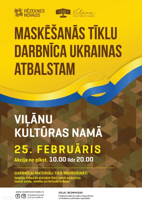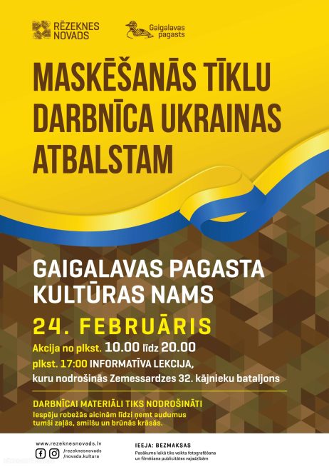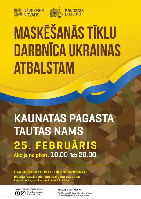 Atbalstot Ukrainu un tās aizstāvjus, šonedēļ Rēzeknes novadā notiks maskēšanas tīklu darbnīcas. Lai gan visi nepieciešamie materiāli tiks nodrošināti, aicinām iedzīvotājus līdzi ņemt audumus brūnās, zaļās un smilšu krāsās. Darbnīcu norises laiks no plkst. 10.00 līdz 20.00.