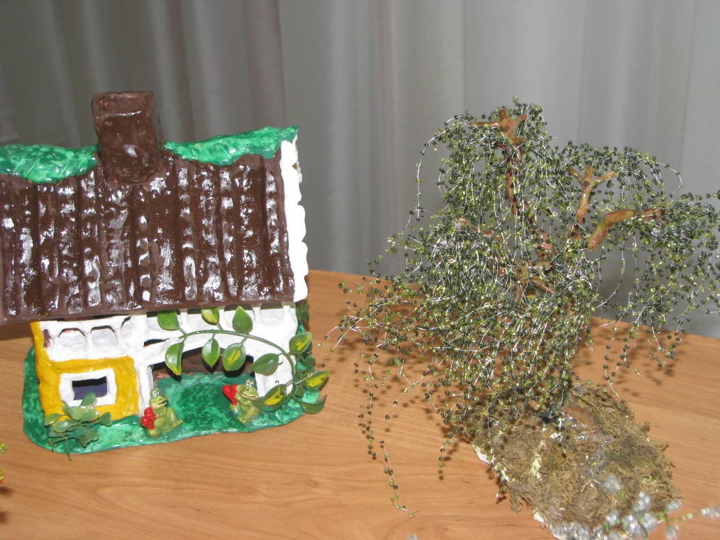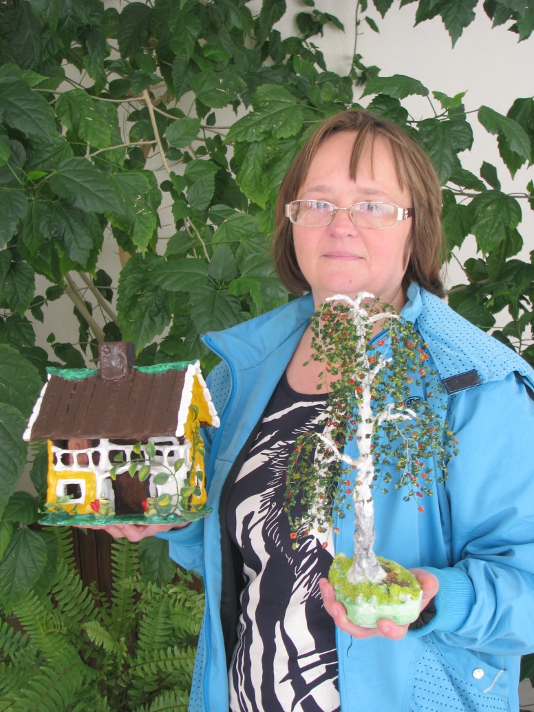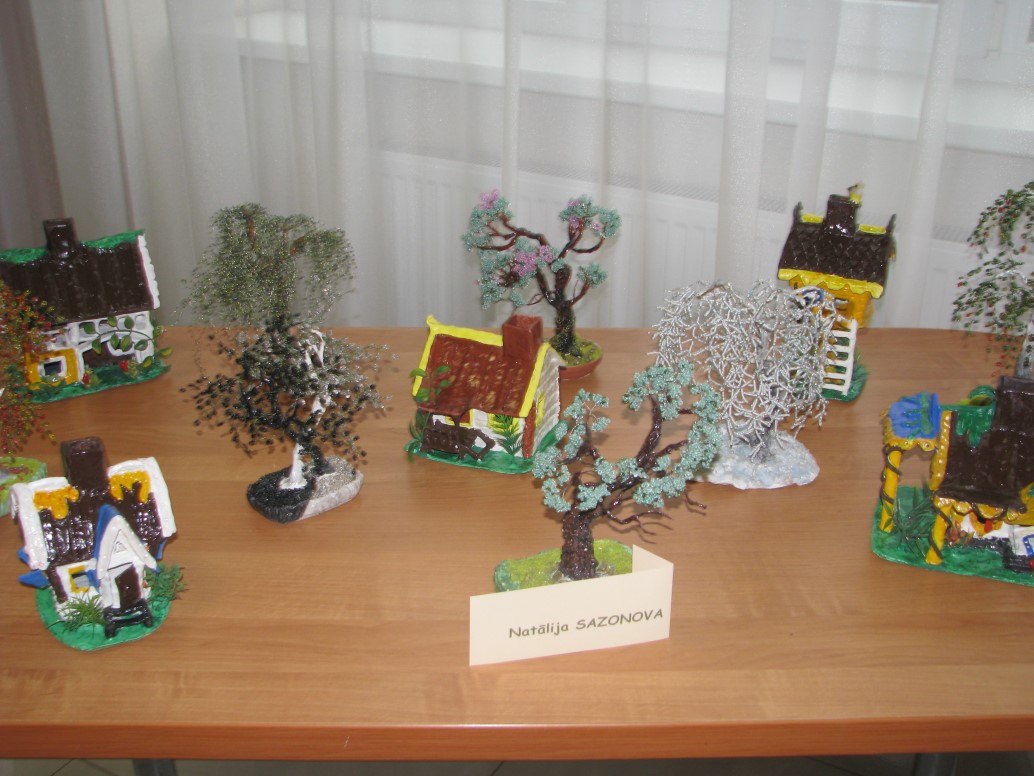 Visvairāk pārsteidza Natālijas Sazonovas darbiņi. Kā izrādās, viņa darina tik skaistus un neatkārtojamus Pērļu kokus, ka liekas prātam neaptverami – tūkstošus, varbūt pat miljonus mazo floristikas pērlīšu pārvērst tādā debešķīgā skaistumā! Un vēl Natālija savām rokām no speciāla ģipša materiāla veido vienreizējus Pasaku namiņus. Kā teica viens no izstādes apmeklētājiem – tas namiņš izskatās tik dzīvs un dabīgs, ka, ja nebūtu miniatūrs, varētu pārcelties uz dzīvi tajā.