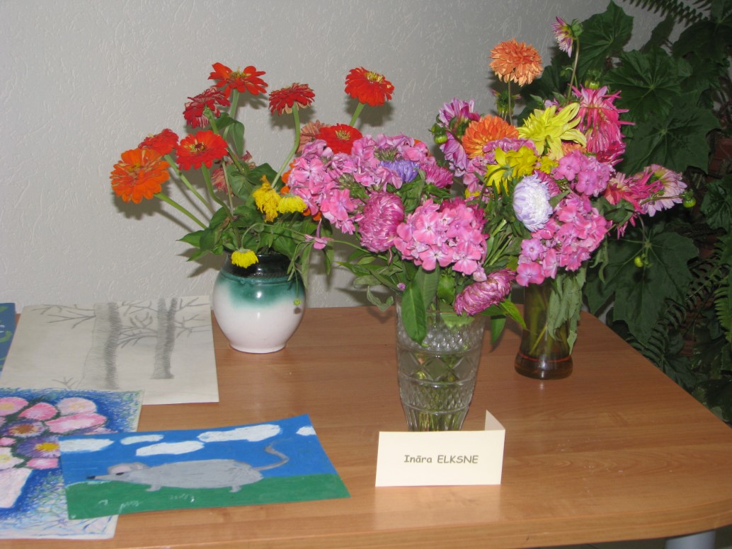 Izstādē kopā bija „sapulcējušās” gan vasaras, gan rudens ziedu skaistules. Vasaras flokši, smaržīgie puķuzirnīši, lilijas, dālijas, asteres, gladiolas, saulespuķes, mazās smaržīgās neļķītes, oranžās kliņģerītes un daudzkrāsainās rudzupuķes, graciozās lauvmutītes un pat visparastākie dārza sīpoli, kuri šogad daudzos dārzos „izskrējuši” ziedos, kopā ar piparmētrām un pupām veidoja brīnišķīgus salikumus un priecēja gan acis, gan sirdi.