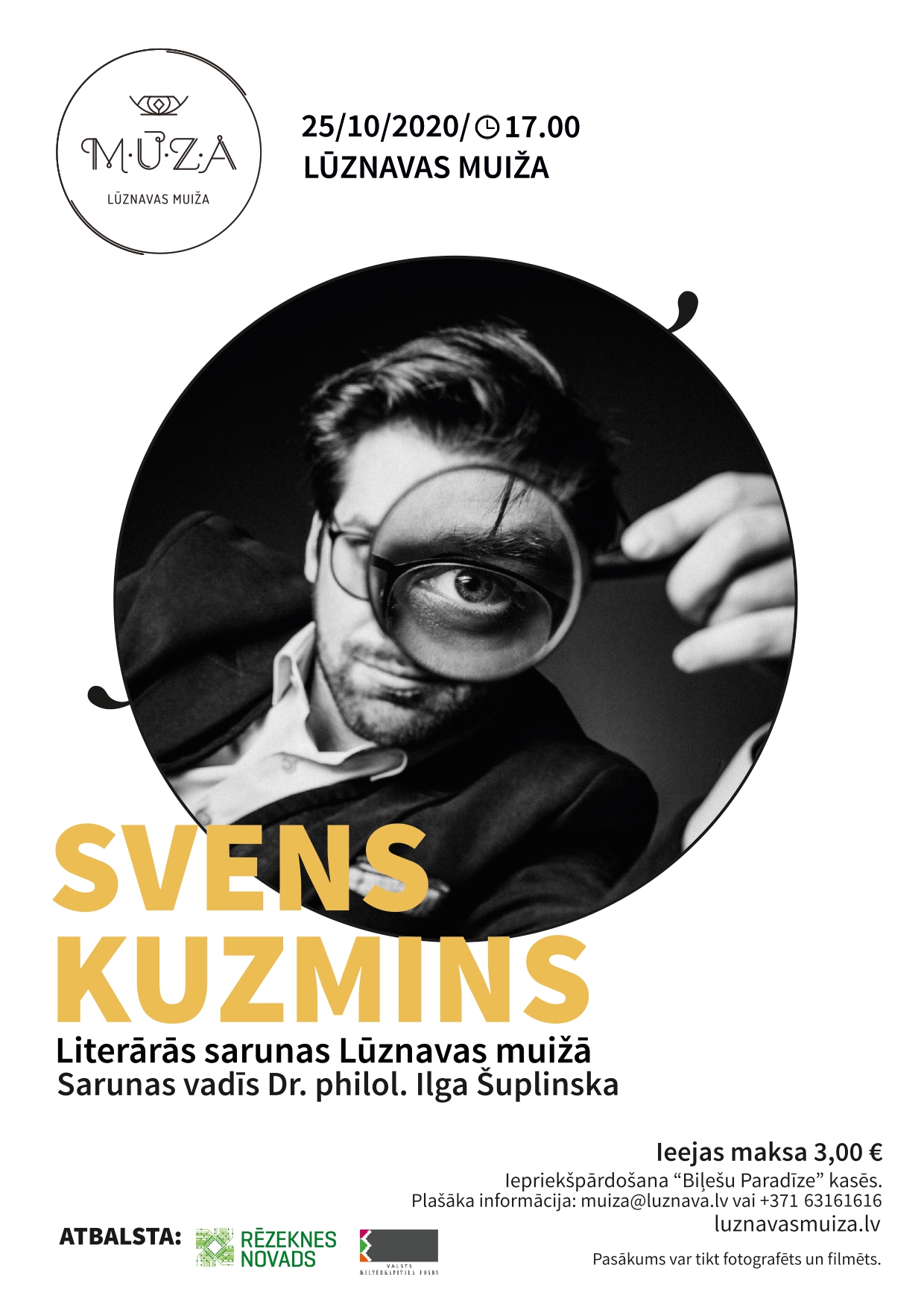 Svētdien, 25. oktobrī, plkst. 17.00 rudens sezonas literāro sarunu cikla Lūznavas muižā otrajā reizē notiks satikšanās ar literātu un mākslinieku Svenu Kuzminu. Sarunai, pirms tam piesakoties, varēs sekot līdzi arī attālināti.