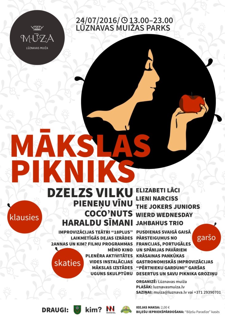 Mākslas piknika laikā no 13.00 līdz 23.00 Lūznavas muižā un tās parkā būs piedzīvojamas skatāmas, klausāmas un garšojamas baudas. Par muzikālo daļu rūpēsies “Dzelzs Vilks”, “Pieneņu vīns”, “Coco’nuts”, Haralds Sīmanis, Elizabete Lāce, Liene Narciss, “The Jokers Juniors”, “Wierd Wednesday”, “JahBahus Trio”, bet dažādās vietās parka teritorijā būs skatāmi: improvizācijas teātra “18PLUS” improvizācijas humoršovs, laikmetīgās dejas izrādes “Bez vadiem”, “Ekskursija” un “Dunkani – dīvaiņi vai pravieši?”, kim? Laikmetīgās mākslas centra producēto mākslinieku video/filmu programma, Rīgas Starptautiskā filmu festivāla “2ANNAS” īsfilmu programma, mēmais kino, vides instalācijas, gaismas objektu un mākslas izstādes, uguns skulptūra. Par gastronomiskajiem pārsteigumiem rūpēsies gan vietējie, gan ārzemju pavāri, organizētās meistarklasēs eksperimentējot ne vien ar ēdiena garšu, bet arī ar kulinārijā pieejamajām krāsām un tekstūrām. Tāpat katrs no pasākuma viesiem aicināts uz pikniku līdzi ņemt savu piepildīto piknika grozu, ko varēs baudīt tam īpaši paredzētās vietās.