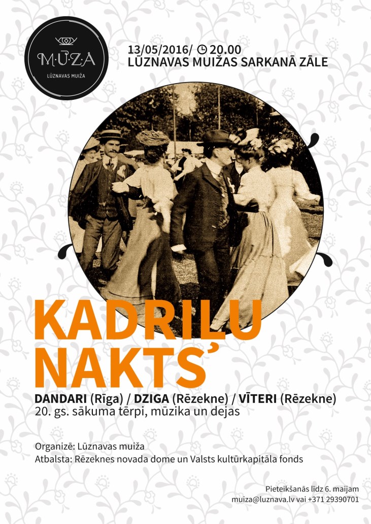 13. maijā 20.00 Lūznavas muiža aicina atgriezties muižas atklāšanas laikā 20. gs. sākumā un baudīt mirdzošo saviesīgo dzīvi, kuru uz pagājušā gadsimta sākumu te vedīs Kadriļu nakts.