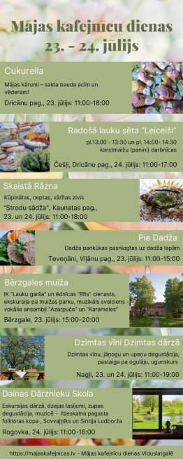 “Mājas kafejnīcu dienas” ir īpašs pasākums, kurā uz vienu vai divām dienām durvis apmeklētājiem ver improvizētas kafejnīcas, aicinot izbaudīt katru Latvijas reģionu caur kulināro piedāvājumu, tradīcijām un kultūru. 23. un 24. jūlijā gardēžu galamērķis ir Viduslatgale – tostarp piedāvājumā arī improvizētās “kafejnīcas” Rēzeknes novadā.