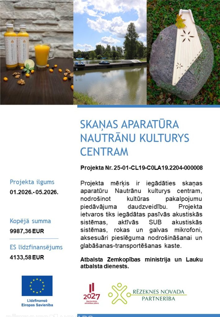 Projekta mērķis ir iegādāties skaņas aparatūru Nautrānu kulturys centram, nodrošinot kultūras pakalpojumu piedāvājuma daudzveidību.