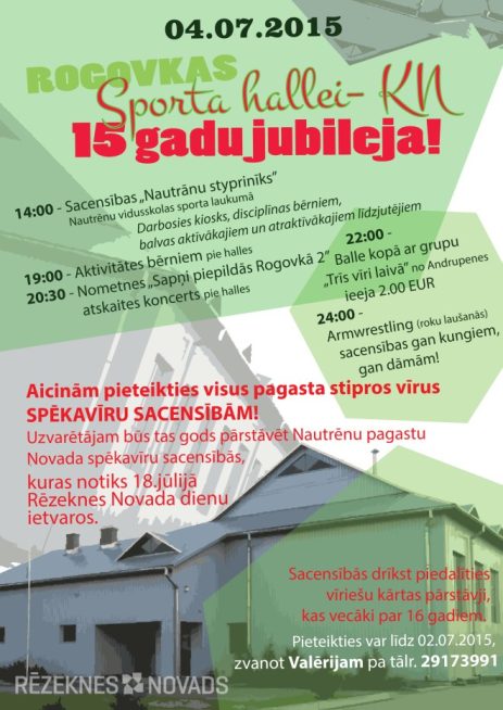 4. jūlijā visi tiek aicināti uz Rogovku, lai atbalstītu Nautrēnu pagasta stiprākos vīrus, apmeklētu pasākumus bērniem, izbaudītu nometnes "Sapņi piepildās Rogovkā 2015" atskaites koncertu, izballētos kopā ar grupu "Trīs vīri laivā", kā arī pacīnītos par uzvaru “Armwrestling” sacensībās! 14:00 dienā gaida vēl nebijušas sacensības „Nautrānu styprinīks” Nautrēnu vidusskolas sporta laukumā.