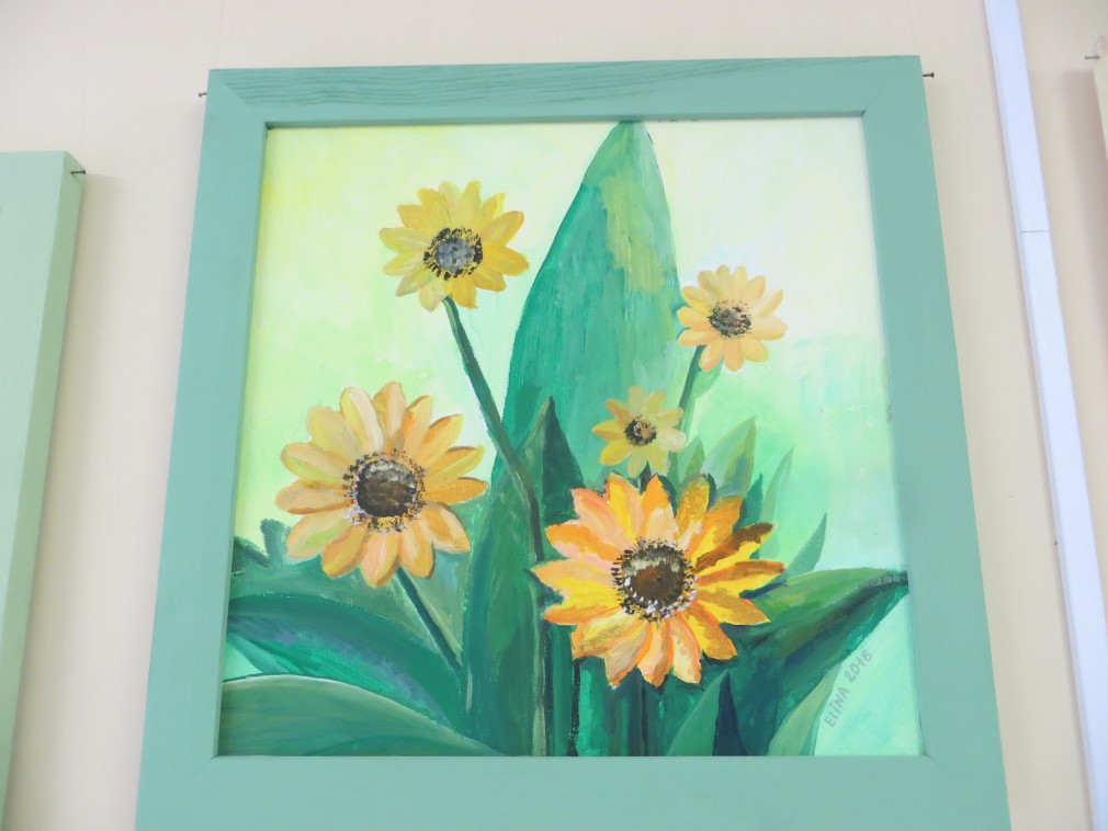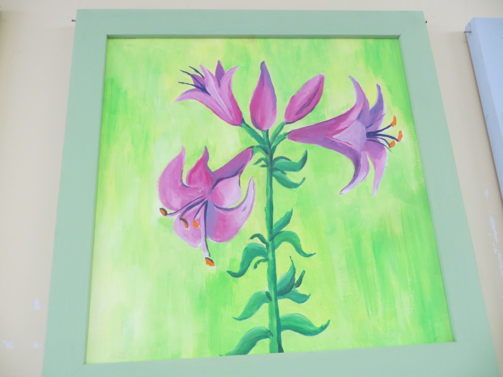 Martā roku iemēģinājām gleznošanas nodarbībās, izvēlējāmies formātus, tehnikas, veidojām vairākas skices, pārdomājām krāsu saskaņu, atkārtojām krāsu apļa likumsakarības, triepienu dažādību, un kā gala rezultāts mums Rogovkas hallē uzziedēja pavasara ziedu dārzs. Nellijas, Elvitas un Elīzas tulpes gleznās smaržoja gandrīz tikpat kā ārā ziedošās, Dzintras un Valentīnas uzgleznotās magones radīja noslēpumainību un romantiku, Elīna un Alīna savos darbos uzgleznoja neatkārtojamās dārza karalienes - rudbekijas, Laima uzgleznoja krāšņākās no pavasara puķēm, Viktorija apmeklētājus pārsteidza ar rozā lilijas ziedu, Elza un Inita izvēlējās vasaras krāšņās skaistules, Velta ļoti rūpīgi uzgleznoja pavasara pirmos vēstnešus – trauslās vizbulītes, mūsu izstādei darbiņu paspēja uzgleznot arī Agita, kura atbrauca ciemos pie vecākiem. Domās mēs jau gleznojam nākamās gleznas un prātojam jaunas idejas. Galu galā tepat jau ir jūnijs -- protams aktīvās atpūtas laiks mūsu siltumnīcās un dārzos, bet pa starpu izveidosim svētku pušķus un sasiesim pirts slotas, un parunāsim ar kādu gudru cilvēku par ārstniecības augu vākšanu un pozitīvu emociju vairošanu.