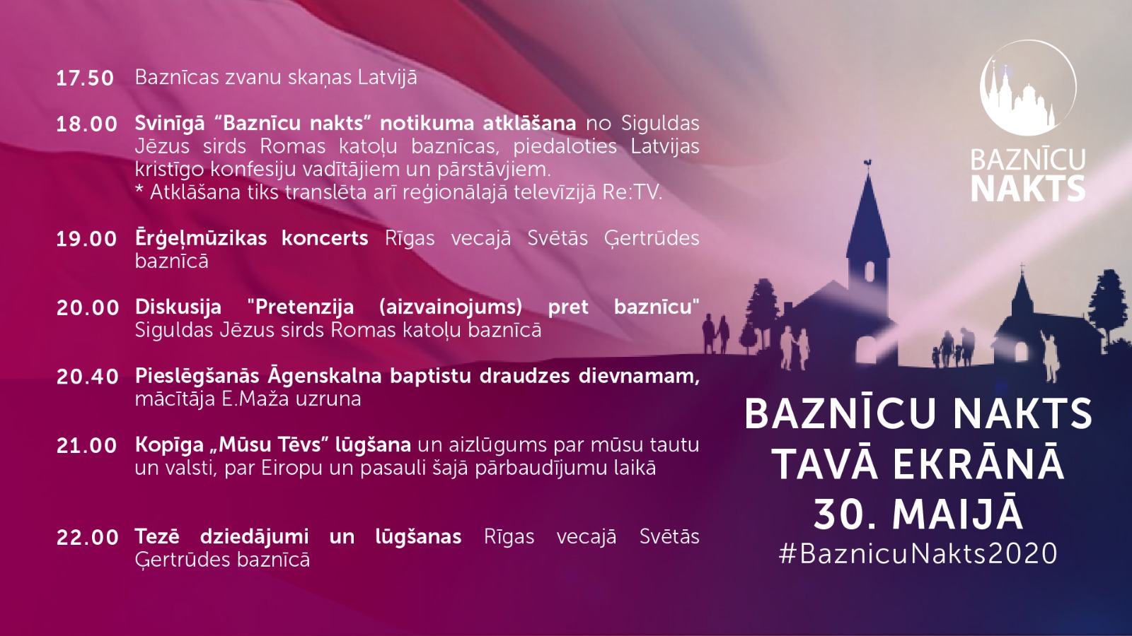 Lai arī ierastā “Baznīcu nakts” norise klātienē šogad nav iespējama saistībā ar ārkārtējo situāciju valstī, ikviens ir mīļi ielūgts sestdienas vakarā sekot notikumam attālināti – sava datora, telefona vai planšetes ekrānā, lietojot tēmturi #BaznīcuNakts2020.
