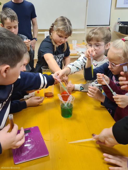 Pamatskolas posmā skolēni piedalījās nodarbībā par ķīmisko reakciju pazīmēm, kas atbilst ķīmijas tēmām “Vielu pārvērtības”, “Ķīmisko reakciju veidi”, “Reakciju norises pazīmes” un “Eksperimentālie novērojumi”. Skolēni vēroja krāsas maiņu, gāzu izdalīšanos, nogulšņu veidošanos un siltuma izmaiņas – galvenās pazīmes, kas palīdz skolēniem noteikt, ka notikusi ķīmiska reakcija. Praktiska darbošanās īpaši atvieglo konkrēto tematu apguves procesu.