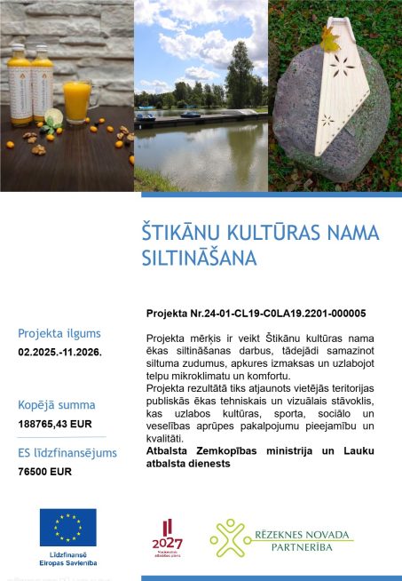 Maltas apvienības pārvalde ir uzsākusi īstenot ES ELFLA intervences "Darbību īstenošana saskaņā ar sabiedrības virzītas vietējās attīstības stratēģiju, tostarp sadarbības aktivitātes un to sagatavošana" (LA 19) aktivitātē "Kopienu spēcinošas un vietas attīstību sekmējošas iniciatīvas" atbalstīto LEADER projektu "Štikānu kultūras nama siltināšana’", Nr. 24-01-CL19-C0LA19.2201-000005.