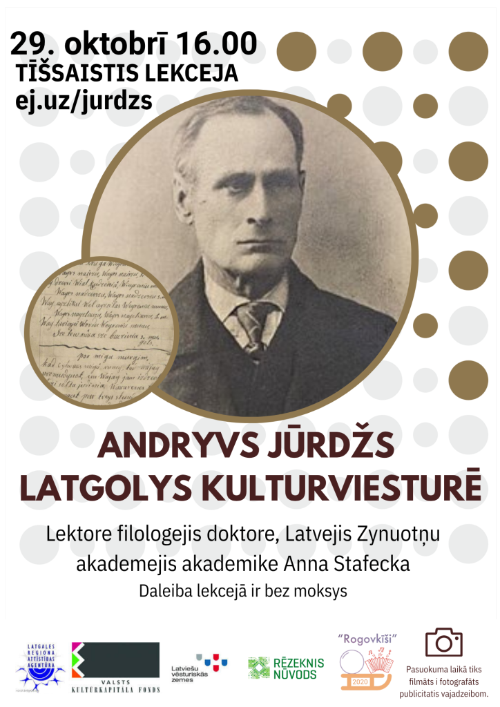 Valsts kultūrkapitāla fonda mērķprogrammas “Latviešu vēsturisko zemju attīstības programma” atbalstītās Latgales kultūras programmas 2025 biedrības "Rogovkīši” projekta “A. Jūrdžam – 180"" ietvaros tiešsaitē 29. oktobrī plkst. 16.00 tiek organizēta filoloģijas doktores, Latvijas Zinātņu akadēmijas akadēmiķes Annas Stafeckas lekcija "Andryvs Jūrdžs Latgolys kulturviesturē".