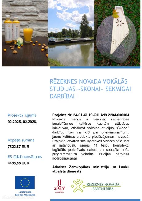 Rēzeknes novada pašvaldība īstenojusi ES ELFLA intervences "Darbību īstenošana saskaņā ar sabiedrības virzītas vietējās attīstības stratēģiju, tostarp sadarbības aktivitātes un to sagatavošana" (LA19) aktivitātē "Kopienu spēcinošas un vietas attīstību sekmējošas iniciatīvas” atbalstīto projektu "Rēzeknes novada vokālās studijas "SKONAI" sekmīgai darbībai".